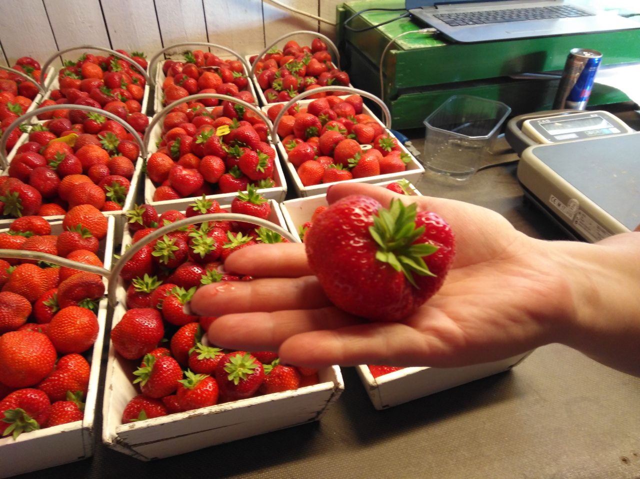 Mansikkaa, vadelmaa ja hernettä myydään kotimyynnin lisäksi Salmisen Mansikkatilan omassa myyntikojussa Porin torilla ja Pick'n Payn edessä Porin Toejoella.